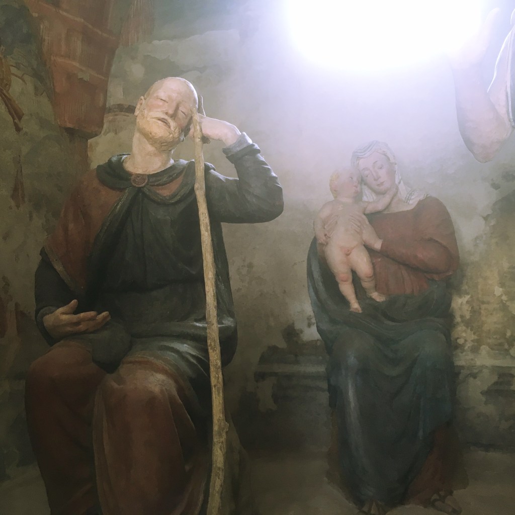 Nicht nur Hanna und Simeon, auch Josef schaut eine Wirklichkeit hinter der Wirklichkeit. Immer wieder träumt er einen Ausblick, was freilich nicht immer leicht ist. Eigentlich nie, weil die Sache mit Gott nicht einfach ist im Sinne von bequem. Aber es gibt eine Perspektive, dass es nämlich zum Heil führen wird. Auf dem Bild vom heiligen Berg Varallo ist der träumende Josef dargestellt. Er ist ganz ausgerichtet auf das Hören und findet so die Perspektive. Ägypten wird zum Schutzort. Das Kind steht dafür, sein Name ist „Gott rettet“.