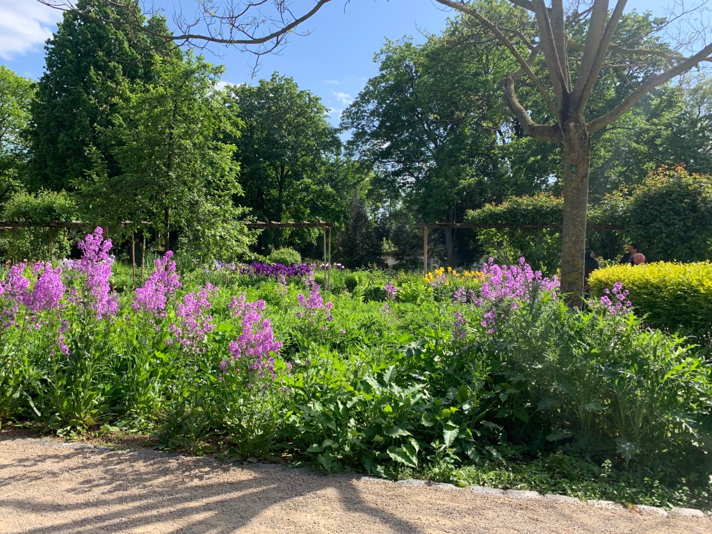 Ich entdecke von meiner Bank aus die Farben: Da ist das frische Maigrün und ganz viel Blau und Violett, ein paar gelbe und weiße Einsprengsel, eine Sinfonie der Farben. Man kann sich nicht satt sehen. Emil scheint es ähnlich zu gehen. Der Knirps watschelt in die Blumen, seine Mutter holt ihn immer wieder freundlich und bestimmt zurück.
