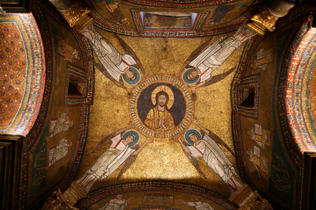 Santa Prassede liegt ein wenig versteckt. Von außen wirkt die Kirche unscheinbar. Geht man hinein. steht man in einer Basilika, die an der Schwelle von der Spätantike zum Frühmittelalter errichtet wurde. Der Barock hat auch hier Spuren hinterlassen, doch die Mosaiken sind noch original. Prächtig spannt sich der Bogen über dem Altarraum. An der Seitenwand zeigt ein Mosaik den Raum, wo das Kleinod dieser Kirche liegt. Es ist die Zenon Kapelle, ein kleiner Raum, der ganz in Mosaiken gefasst ist. Wenn die Mosaiken dem Betrachter etwas vom Himmel zeigen wollten, dann kann man in dieser Kapelle sozusagen einen Blick und sogar einen Schritt in den Himmel machen. Dort begegnet man Heiligen und oben halten vier Engel das Gewölbe, in der Mitte ist Christus und segnet.