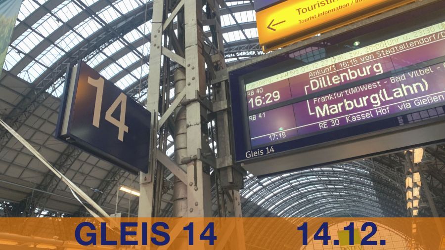 Viele Hinweisschilder gibt es am Bahnhof, damit man sich zurecht findet in den großen Hallen, Ankunft und Abfahrt findet. Pfeile weisen zu den Gleisen, zur Bahnhofsmission, den Ausgängen und der Markthalle. Jedes Gleis hat seinen eigenen Anzeiger und Buchstaben zeigen an, wo welche Wagen stehen. Hier und da gibt es runde Schilder in der Größe eines Verkehrsschildes. Ein Männchen ist darauf abgebildet, das die Arme nach rechts und links ausstreckt. Hier ist kein Durchgang, zeigt es an.