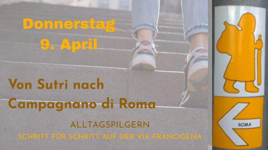 Der erste Abschnitt der heutigen Etappe führt wieder über staubige Pisten bis nach Monterosi. Die Wegführung benutzt ab hier die Via Cassia. Das ist Grund genug, den Bus zu nehmen, denn die Cassia ist hier vierspurig wie eine Autobahn ausgebaut. In einem Tabaccaio bekomme ich die Busfahrkarte. Einen genauen Fahrplan gibt es wohl nicht, so in 1 ½ Stunde solle der Bus fahren. Die Bushaltestelle liegt an einem Wendekreisel. Ich hocke erst auf dem Bordstein, später auf einer Bank. Immer, wenn ein Bus kommt, stehe ich auf, nehme den Rucksack und frage den Busfahrer, ob er nach Campagnano fahre. „Va a Campagnano?“ „No“ lautet die Antwort. Das geht eine gute Stunde so, ungefähr zwölfmal. Doch dann höre ich endlich das erlösende „Si“. Der Bus nimmt die Cassia und bringt mich ans Ziel des Tages. Aus dem Fenster sehe ich hier und da ein Pilgerzeichen. Tatsächlich soll man den Standstreifen nehmen.